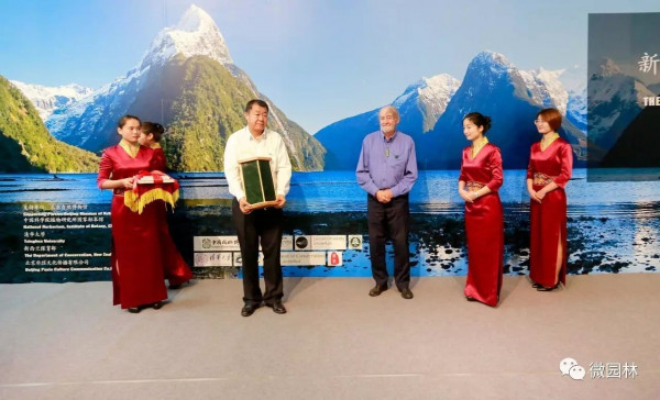 新西兰毛利纳塔湖部落代表邱迪先生致辞,并赠送“毛利玉”雕刻品。园博馆馆长李炜民接受捐赠,并回赠由园博馆研发的最具中国古典园林艺术精髓的一池三山香插及中国园林博物馆的出版物。